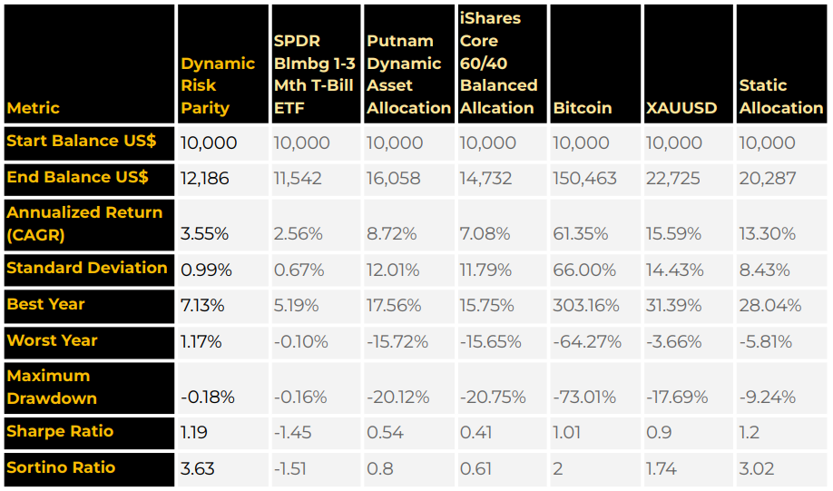 - 정적 크립토-전통 혼합, 5) 전통 리스크 패리티(RPAR ETF 대리), 6) 동적 주식-채권 배분(Putnam 펀드 대리)