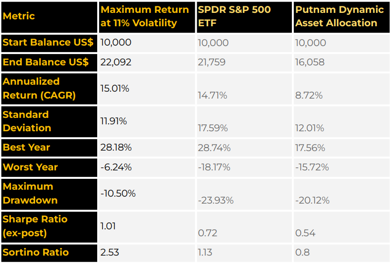 - 목표 변동성 11%를 겨냥한 전략은 연 15.01% 수익률로 S&P 500 ETF(14.71%)를 상회하면서, 최대낙폭 -10.50%로 S&P 500의 -23.93% 대비 현저히 낮은 위험을 보였습니다.