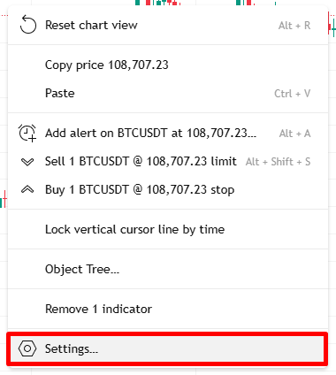 - [Scales and lines] : 우측 가격 축, 하단 시간축 등에 보이는 추적선·라벨을 설정합니다. 예) 당일 고·저가, 봉 마감 카운트다운.