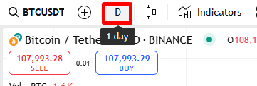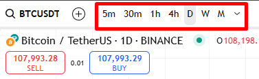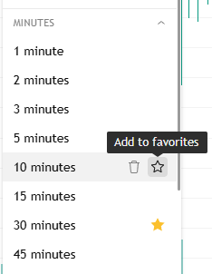 좌상단 드롭다운에서 초 단위부터 월봉까지 간격을 조정해요. ★을 클릭해 즐겨찾기로 등록하면 빠르게 전환할 수 있습니다.