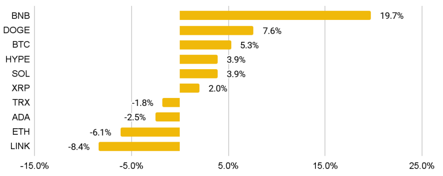 - BNB +19.7%: 생태계 성장과 기업 자금관리 수요 확대. Aster DEX 출시 후 초저수수료·사상 최고 거래로 온체인 활동 급증. 프랭클린 템플턴의 Benji Investments가 BNB 체인으로 확장.