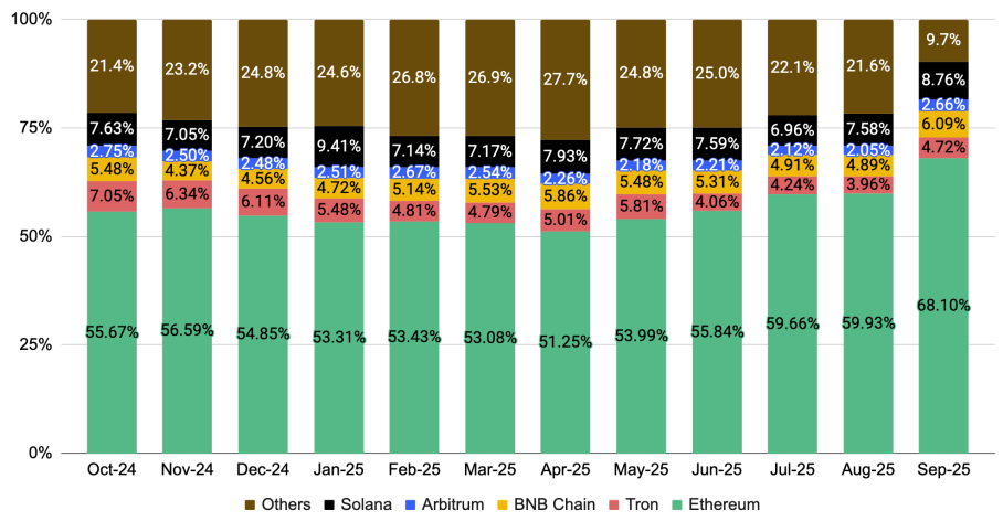 2025년 9월 디파이 TVL은 전월 대비 3.0% 증가했습니다. 무기한 DEX와 스테이블코인 프로젝트의 강한 출시가 사용자 참여 확대에 기여했습니다. 상위 5개 디파이 생태계 모두 점유율을 높였고, 이더리움의 증가폭이 가장 컸습니다.