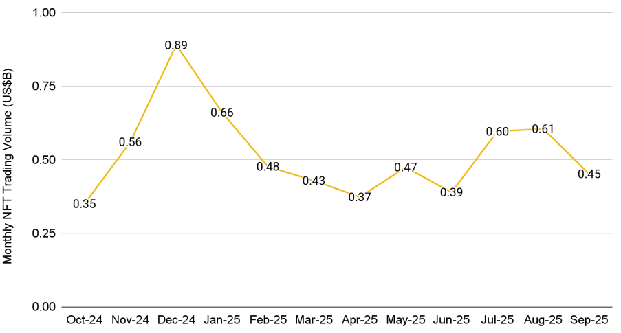 2025년 9월 NFT 총 판매액은 25.5% 감소, 직전 두 달의 강한 모멘텀 일부를 반납했습니다. 이더리움 NFT는 선두를 유지했지만 월간 판매 −54.8%로 큰 폭 둔화. 폴리곤 −54.6%, BNB 체인 −72% 등 타 체인 성과도 부진했습니다.