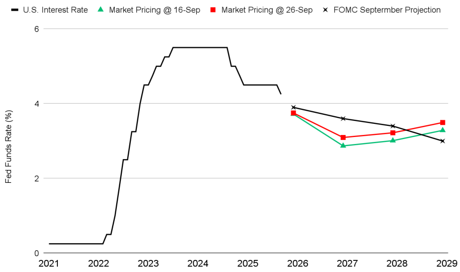 - 단기(2026년): 9/17 인하 이후 FOMC 9월 SEP 중간값에 맞춰 상향 조정. 완화는 시작됐으나 속도·규모는 완만하다는 인식.