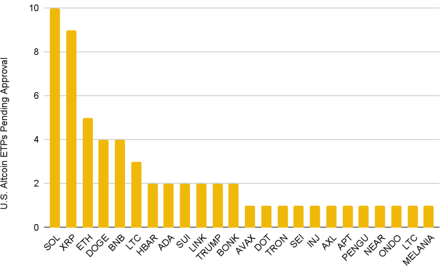 블룸버그의 Eric Balchunas에 따르면 연말까지 90개+ 크립토 ETP 승인이 예상됩니다. 솔라나(10건), XRP(9건)가 선두이며, SEC의 표준화 상장 프레임워크가 승인 기간을 최대 240일 → 최소 75일로 단축해 발행사 승인 효율을 크게 높였습니다.