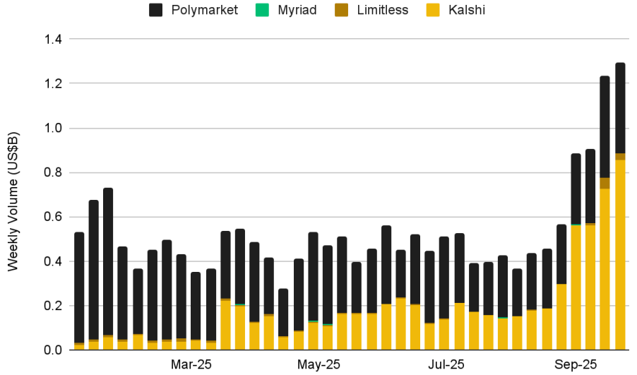 예측시장은 올해 들어 최고 주간 명목거래규모를 기록했습니다. Kalshi는 주간 US$850M을 넘기며 Polymarket을 선두에서 추월했습니다. 규제 거래소 연계, 소비자 도구 통합으로 도달 범위를 넓힌 것이 주효했습니다. 또한 NFL 시즌과 맞물린 스포츠 연계 계약 확대로 미 대선 사이클 수준의 볼륨을 견인했습니다.