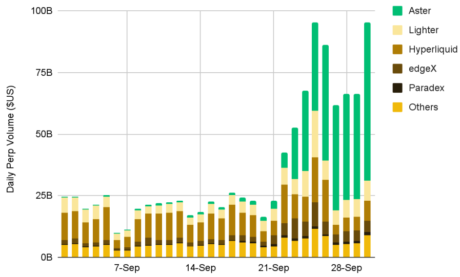 무기한 선물 DEX는 폭발적 성장 국면에 진입했습니다. 일일 총합 거래대금 US$65–70B를 상회했고, 9월 DEX/CEX 무기한 비율은 약 18%로 사상 최고치입니다. Aster는 24시간 최대 US$43B를 기록하며 온체인 무기한 거래의 과반을 꾸준히 차지했습니다.