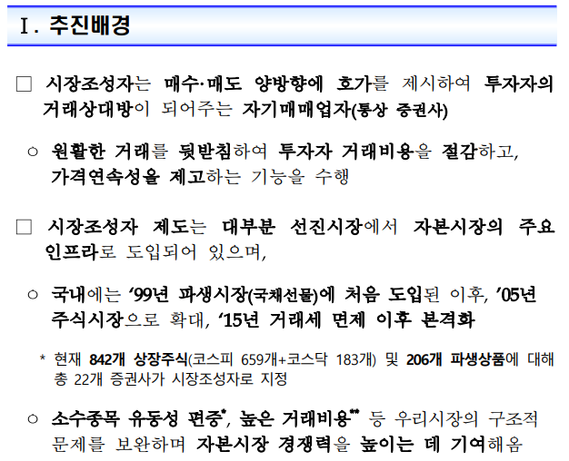 또, 재무건전성과 내부통제 능력을 갖춘 증권사만이 시장조성자가 될 수 있도록 자격 요건을 엄격하게 설정함으로써, 시장조성 행위가 일정 수준 이상의 신뢰를 바탕으로 이루어지도록 설계하고 있습니다.