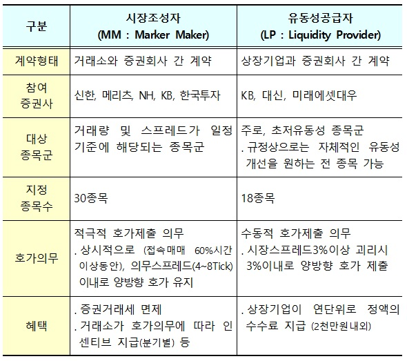 국내 자본시장에서는 거래소와 증권사가 계약을 맺어 활동하는 주체를 ‘시장조성자(MM)’, 상장법인과 증권사가 계약을 맺어 특정 종목 유동성을 보강하는 주체를 ‘유동성공급자(LP)’로 구분하지만, 두 제도 모두 저유동성 종목에 대해 매도·매수 양방향 호가를 지속적으로 제공한다는 공통된 목표를 갖습니다.
