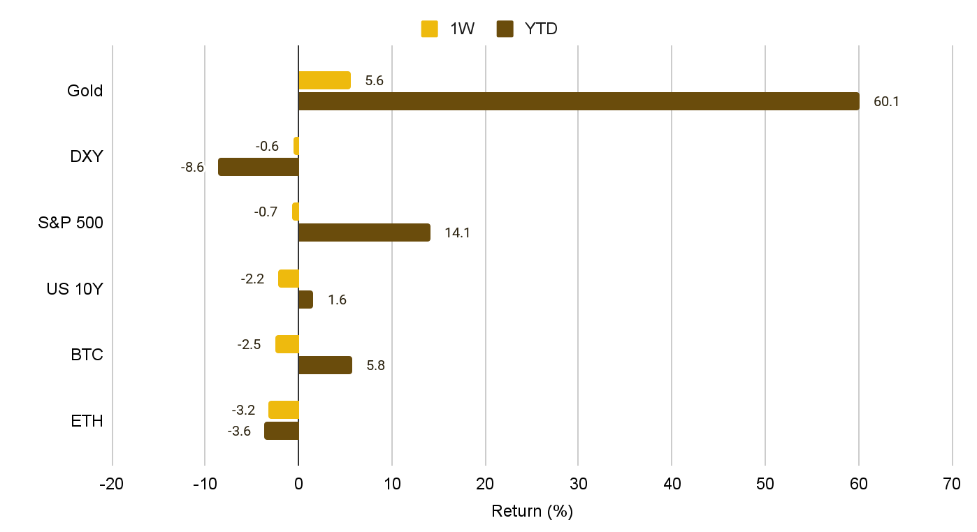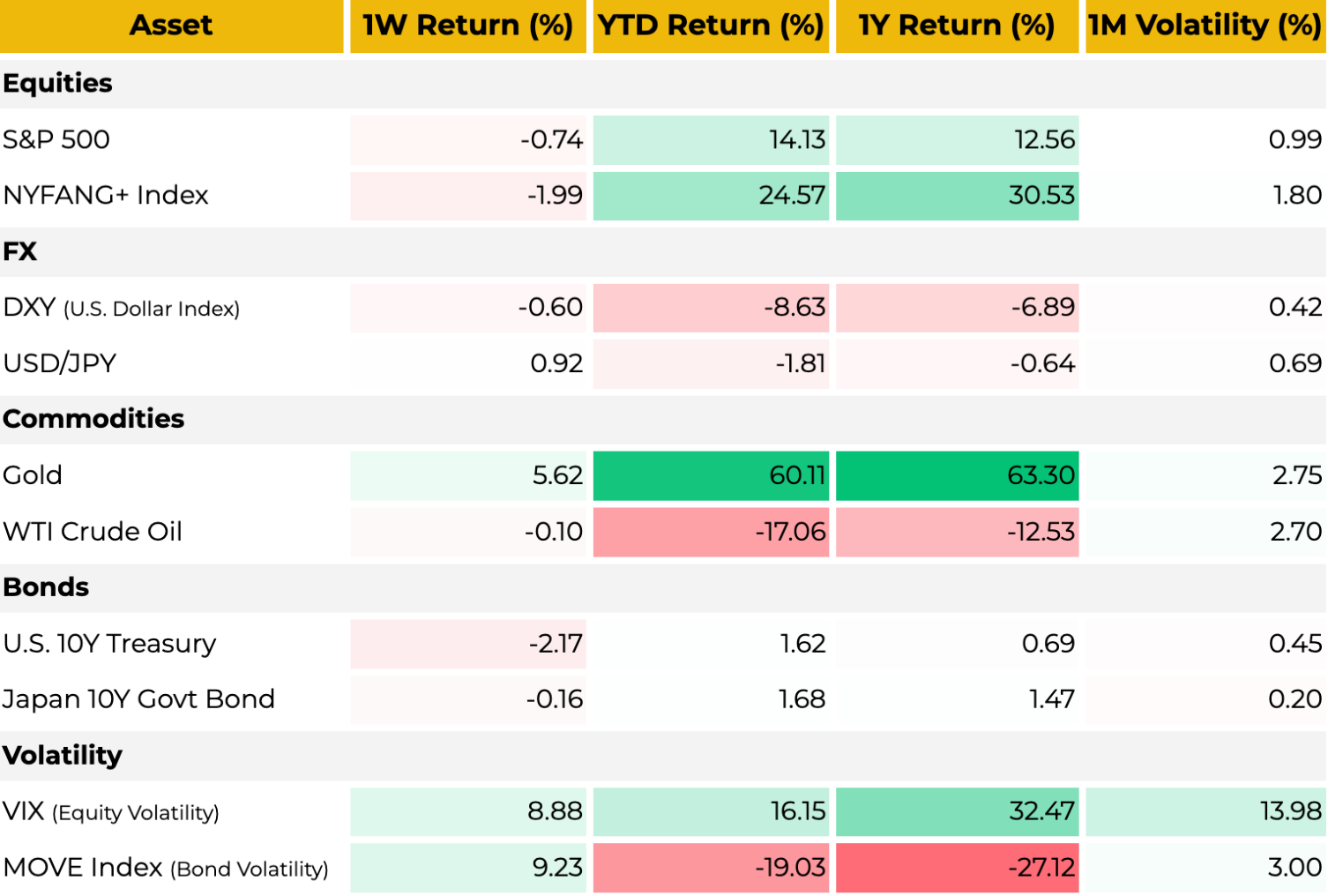 종합적으로 보면, 이번 주는 금이 상대적으로 강세를 보인 반면, 달러와 미 국채, 비트코인은 모두 조정을 받으며 시장의 신중한 분위기를 반영했습니다.