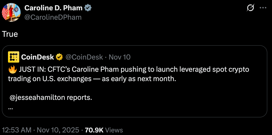 미 상품선물거래위원회(CFTC) 카롤린 팜(Caroline Pham) 직무대행 의장은, 이르면 다음 달부터 미국 내 규제된 거래소들과 함께 레버리지 스팟 크립토 거래 상품을 출시하기 위해 논의 중이라고 확인했습니다. 이는 그동안 일반 미국 투자자에게 제공되지 않았던 서비스라는 점에서 규제 측면에서 큰 진전입니다.