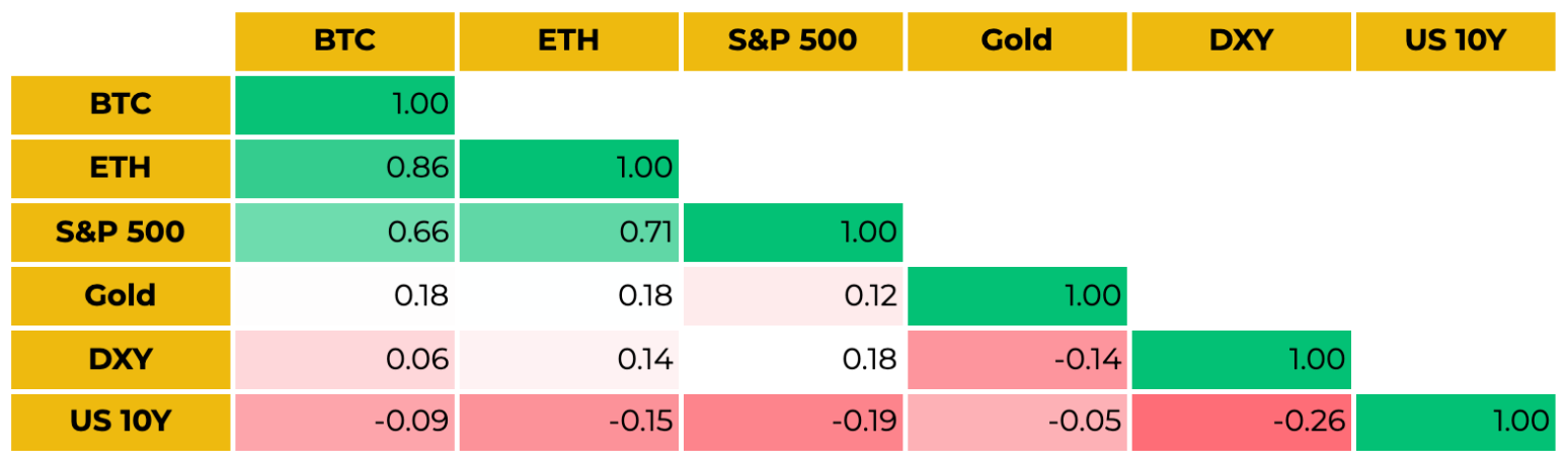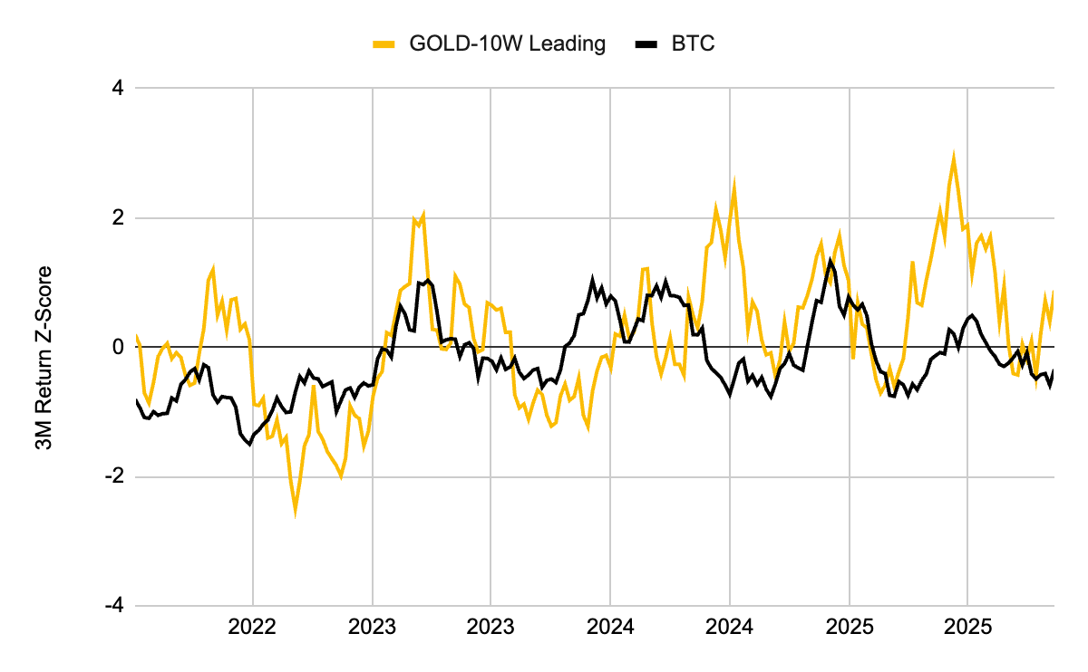 당사의 과거 분석에 따르면, 금 가격은 비트코인에 약 10주 정도 선행하는 경향이 있습니다. 이 관점에서 보면, 9월 이후 금이 재차 상승 추세를 보이기 시작했다는 점은 11월 말로 향해 가는 크립토 시장에 긍정적인 신호라고 해석할 수 있습니다.