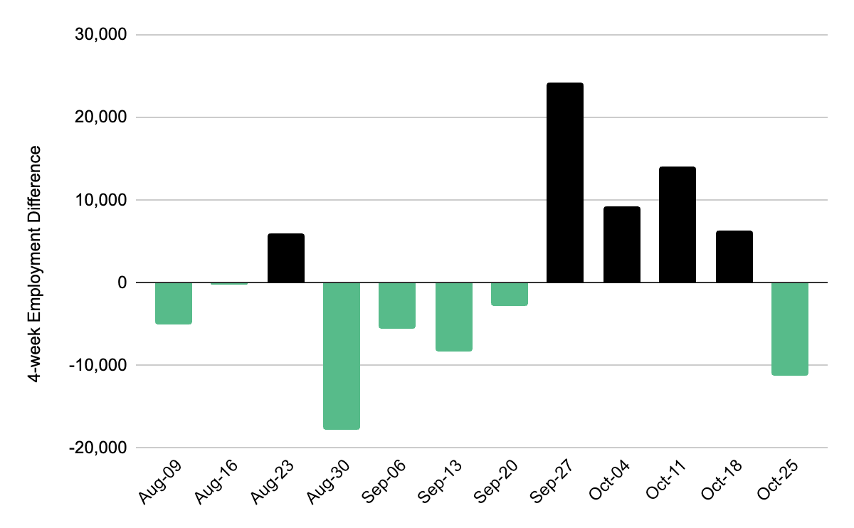 ADP 주간 고용 데이터 약화: 10월 25일로 끝나는 4주 동안, ADP 주간 고용 보고서에 따르면 민간 기업은 평균 주당 1만1,250명 수준의 해고를 단행했습니다. 이는 10월 한 달 동안 민간 부문에서 약 4만5,000개의 일자리가 사라졌을 수 있음을 의미하며, 예상 밖의 음(-)의 수치를 기록하면서 뚜렷한 경기 경고 신호로 해석됩니다.