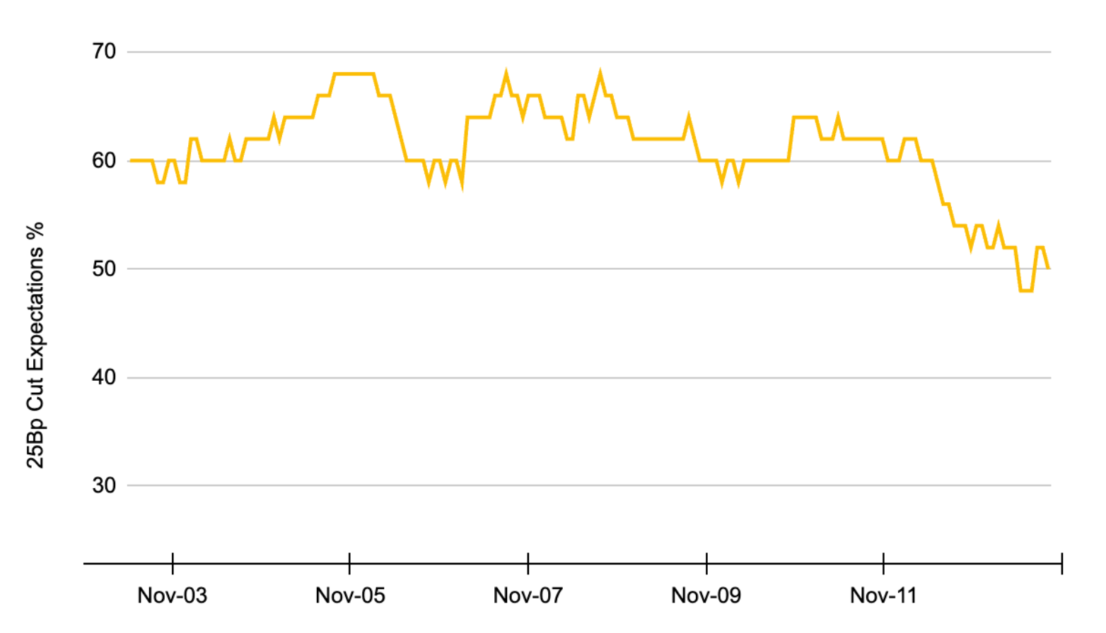 이러한 발언의 영향으로, 12월 금리 인하에 대한 시장 기대는 지난주 70% 수준에서 50% 수준으로 급락했습니다.