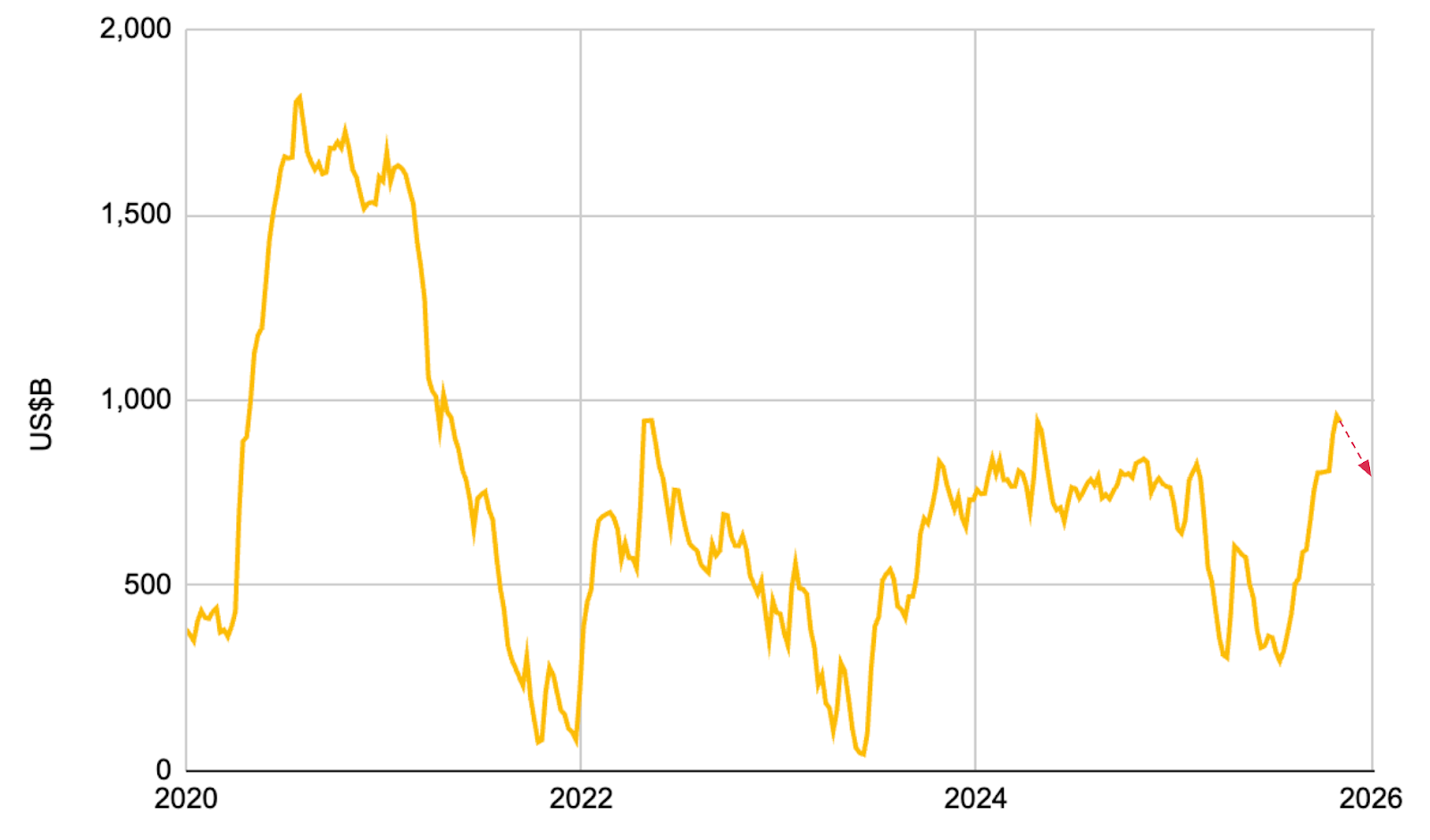 지난주 재무부는 2025년 4분기 말까지 TGA 잔고를 8,500억 달러 수준으로 복원한다는 목표를 발표했습니다. 셧다운 종료로 인해, TGA 잔고는 11월 하반기 중 이 목표 수준으로 빠르게 되돌아갈 것으로 예상되며, 이는 단기 자금시장 압력을 완화하는 요인입니다. 당사의 판단으로는 실제 정부 지출이 더 높게 집행되면서, 잔고는 일시적으로 8,500억 달러 아래로 내려갈 수 있습니다. 이는 단 한 달 만에 1,000억 달러를 상회하는 순유동성 공급을 의미하며, 전체 시장 유동성에 상당한 순풍이 될 수 있습니다.