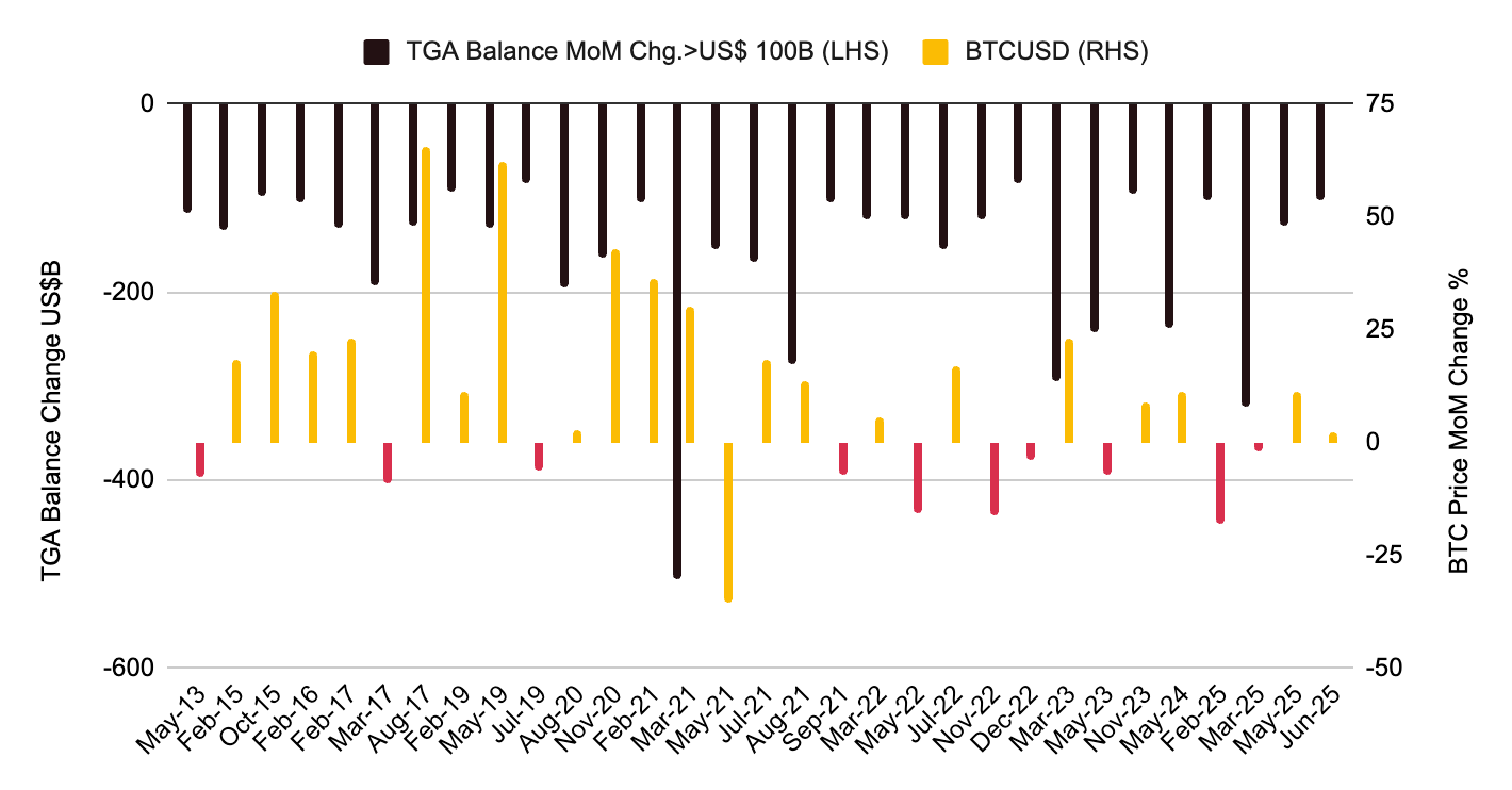당사 분석에 따르면, 2013년 이후 TGA 잔고가 한 달 동안 800억 달러 이상 감소한 시점들을 살펴볼 때, 비트코인 가격은 그중 약 61%에서 상승했고, 평균 상승률은 8.8%, 중앙값은 2.7%였습니다. 수치 자체가 극적이라고 보기는 어렵지만, TGA 유동성 방출과 비트코인 가격 사이에 통계적으로 의미 있는 긍정적 상관관계가 있음을 시사합니다.