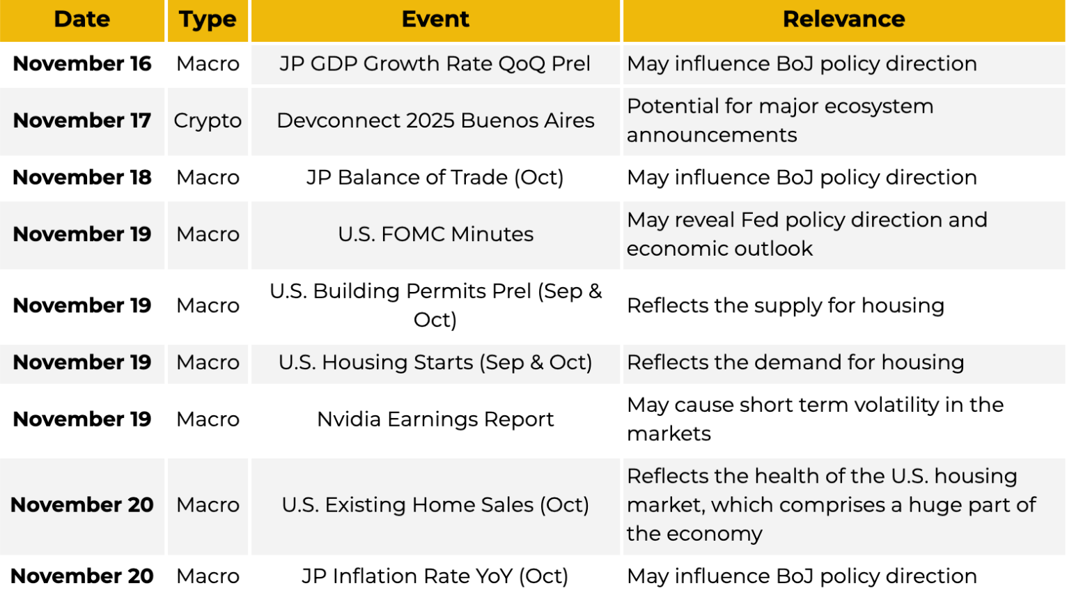 단기적으로는 1,000억 달러 이상 규모의 TGA(미 재무부 일반계정) 유동성 방출과 CFTC의 레버리지 스팟 BTC/ETH 거래 승인 가능성이 호재로 작용할 수 있습니다. 금이 약 10주 정도 선행하는 지표라는 과거 분석을 감안하면, 최근 금 랠리는 11월 말 크립토 매수세 재점을 시사하기도 합니다. 다만 11월 19일 예정된 엔비디아(NVDA) 실적 발표, CPI·NFP 발표 일정 불확실성, 내년 1월 말 재셧다운 리스크 등으로 가시성은 여전히 낮습니다.