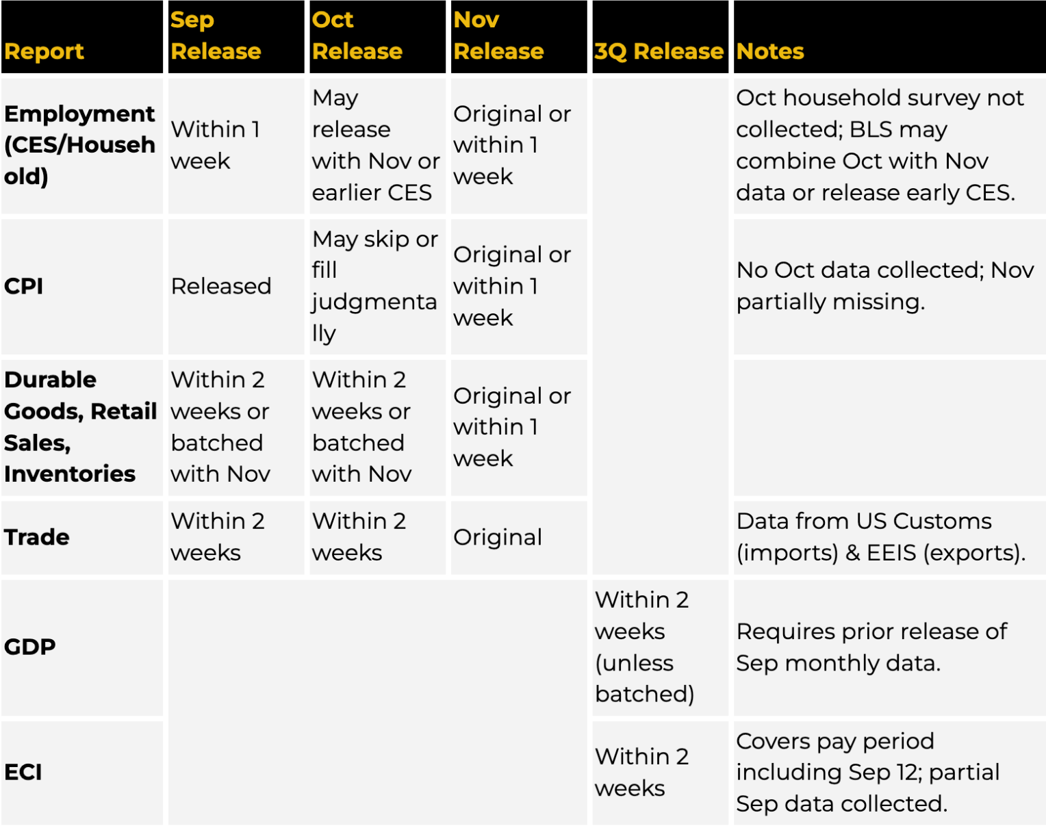 2013년 셧다운 사례(기간이 더 짧았고, 2018~19년 셧다운은 통계기관 예산이 유지되었다는 점에서 참고 한계가 있음)를 감안하면, 잠정적인 통계 발표 일정은 다음과 비슷하게 전개될 수 있습니다.