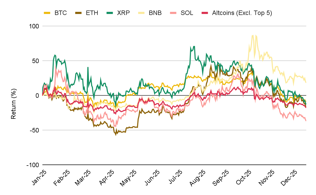 연말 계절성 분석에 따르면, 비트코인은 역사적으로 크리스마스 직전 1주에 80%의 승률을 보이는 경향이 있습니다. 이후 새해까지는 유동성이 낮은 “노이즈 국면”으로 약세를 보인 뒤, 1월 초에는 60% 확률과 평균 +5%의 수익률로 반등하는 패턴이 관측됩니다. 이 패턴은 주식과도 유사하지만, 크립토는 장 초반 구간에서 더 큰 알파를 보이는 경향이 있습니다.
