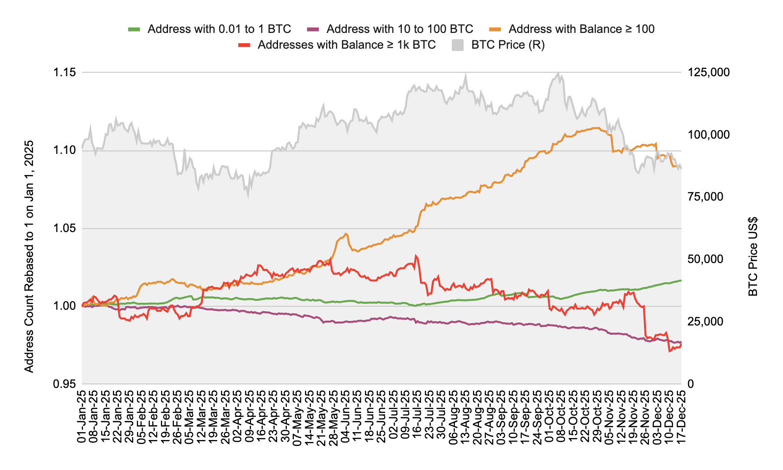반면, 0.01–1 BTC를 보유한 소규모 주소는 같은 기간 68,066개 증가(+1%)했습니다. 이는 리테일 유입이 지속되고 있음을 의미하지만, 현재까지는 고래 주도의 디리스킹 및 분배 압력을 흡수하기에는 충분하지 않았음을 시사합니다.