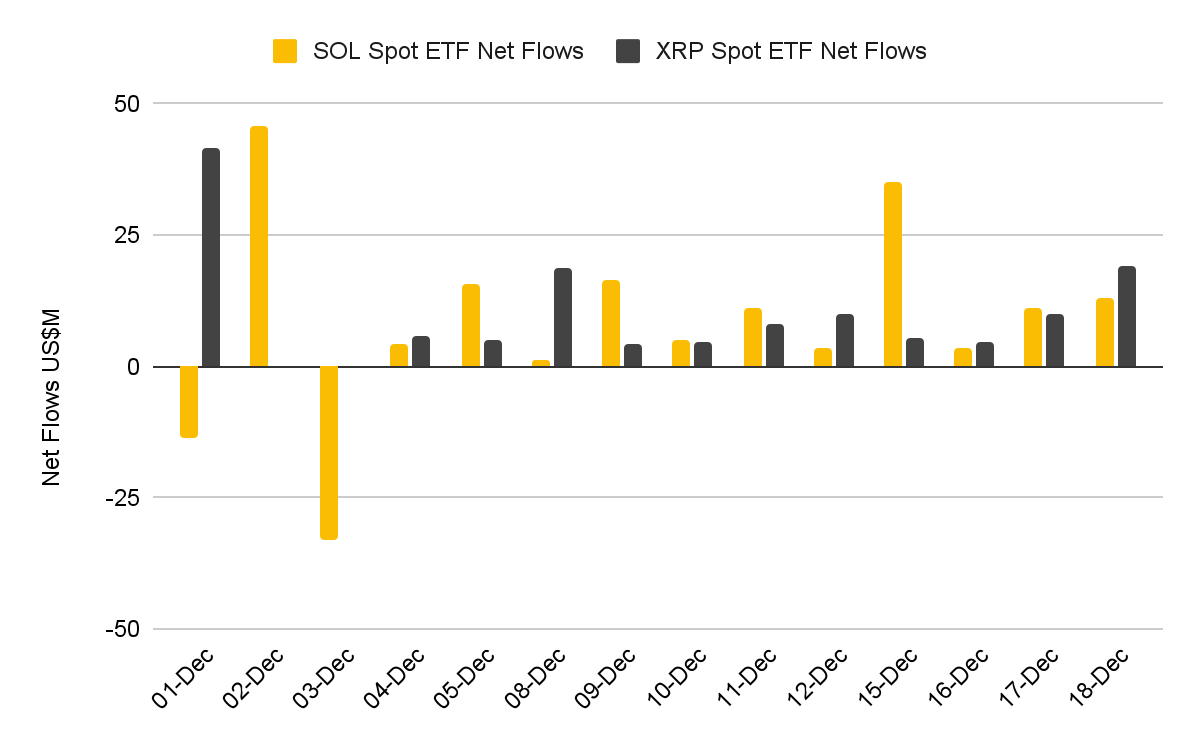한편 ETH, SOL, XRP, ADA 등 주요 알트코인의 가격 흐름은 더 약했으며, 대체로 주간 -5%에서 -11% 수준의 하락을 기록했습니다. 다만 SOL과 XRP 현물 ETF는 드문 밝은 지점이었습니다. 두 ETF 모두 시장 전반의 조정 속에서도 유입을 이어가며, 순유입 연속 기록을 11거래일로 늘렸습니다.