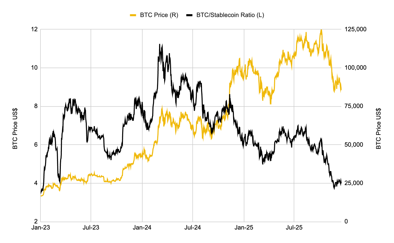 가격은 추가 하락했지만, 중앙화거래소(CEX) 내 BTC/스테이블코인 잔고 비율은 더 이상 하락하지 않고 멈췄습니다. 이는 매수와 매도가 대체로 균형을 이루고 있다는 중립적 신호입니다.