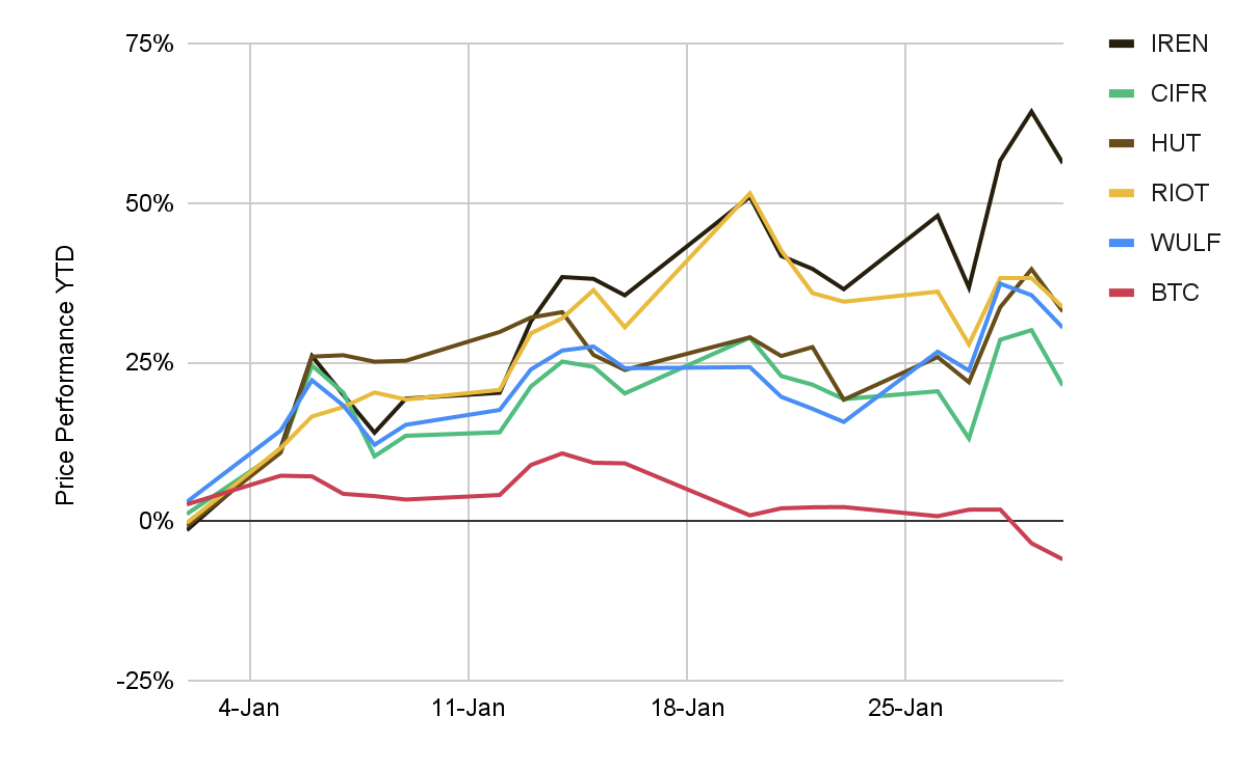 비트코인 자체는 하락 마감했으나, 비트코인 채굴 주식은 지난 주 초, 특히 2026년 1월 27일과 28일에 눈에 띄는 랠리를 보였습니다. 27일 아이리스 에너지(IREN)는 13.63%, 어플라이드 디지털(APLD)은 13.12%, 사이퍼 마이닝(CIFR)은 12.76% 급등했으며, IREN과 헛 에이트(HUT)는 다음 날에도 상승세를 이어갔습니다.