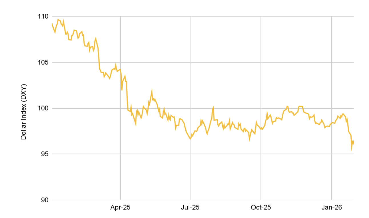 지난 DXY 수치는 2022년 2월 이후 가장 낮은 수준이며, 지난 주에만 2.2% 하락했습니다. 이는 2025년의 상당한 조정 이후 지난 1년간 이어진 약 11%의 하락 추세가 확장된 것입니다.