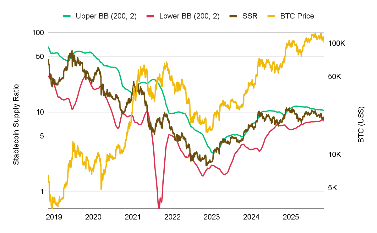 유동성이 실제로 축소됐는지, 단지 회전했는지 평가하기 위해 SSR(Stablecoin Supply Ratio)를 함께 봅니다. BTC 시가총액 하락 속도가 스테이블코인 총공급보다 빠르며 SSR이 급락, 과거 스트레스 구간처럼 하단 볼린저 밴드 부근으로 수렴했습니다.