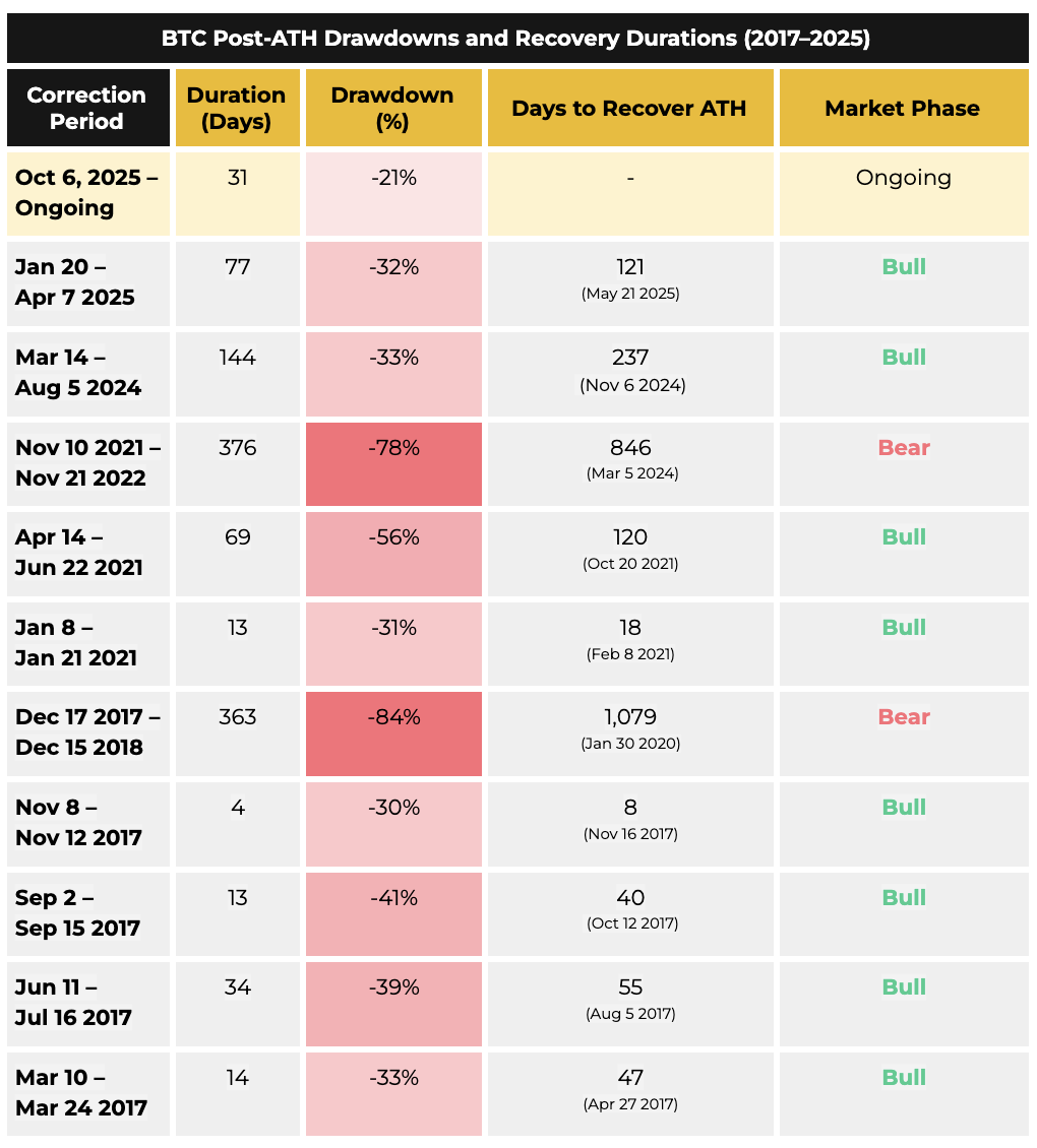 가격 사이클 관점에서 보면, BTC의 10월 6일 고점(12.6만 달러) 대비 21% 되돌림은 과거 사이클의 ATH 이후 조정 패턴(통상 30–40%)과 부합합니다. 이는 추세 전환보다는 포지션 리셋을 동반한 박스권 정체로 기능했던 역사적 전례와 유사합니다.