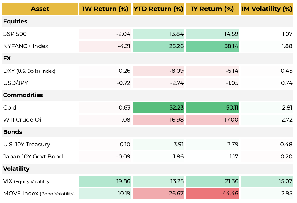미국 주요 지수는 리스크오프 재부각으로 하락했습니다. S&P 500 약 -2.04%, NYFANG+ 약 -4.21%. 기술 실적 부진, AI 밸류에이션 우려, 거시 불확실성이 심리를 눌렀습니다.
