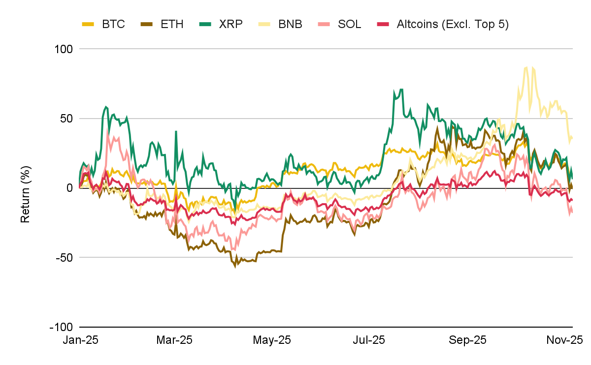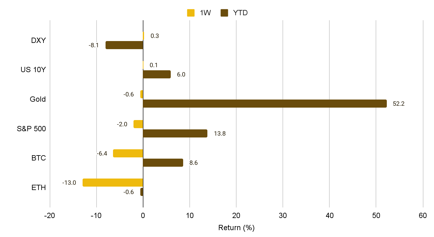 디지털 자산은 지난주 약세를 이어갔고 심리 악화가 심화되었습니다. 지난달의 마진 주도 조정에 이어 이번 주에도 연속 이틀간 미화 12억/16억 달러 규모의 레버리지 포지션이 청산되었습니다. BTC -6.4%, ETH·SOL 및 광범위 알트는 YTD 기준으로도 마이너스로 전환했으며, 베타가 높은 종목일수록 펀딩 유출 지속 속에 낙폭이 컸습니다.