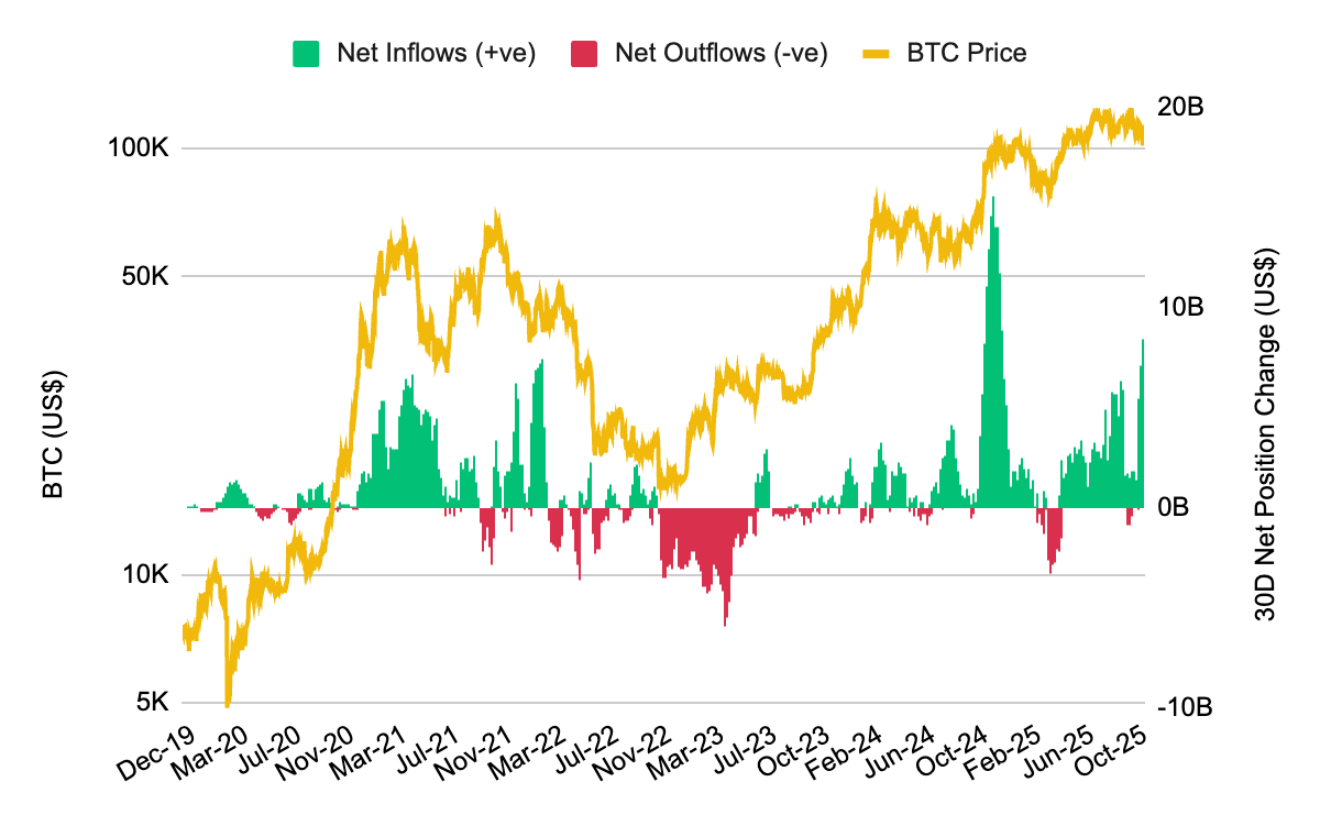 이번 조정은 광범위한 위험 축소를 반영합니다. 최근의 대규모 청산과 관세 관련 이슈에 따른 투자심리 위축에 더해, 장기화된 미국 정부 셧다운, 매파적으로 기울 수 있는 연준, 지속되는 정책 불확실성 등이 겹쳤습니다. 가상자산 시장에는 Balancer의 1억 달러+ 규모 익스플로잇 같은 온체인 이슈도 추가적인 압박으로 작용했습니다.