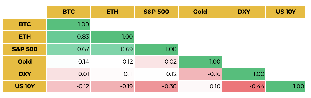 비트코인과 이더리움·주식의 상관관계는 강화, 반면 달러지수 등 전통 안전자산과의 상관관계는 약화·비일관적입니다. 이는 거시 스트레스 국면의 단기적 전형으로, 초기에는 리스크자산과 동행하다가 여건 안정 시 디커플링하는 양상입니다. 흥미롭게도 금과의 상관계수는 0.08 → 0.14로 상승했지만, 여전히 약한 수준입니다.