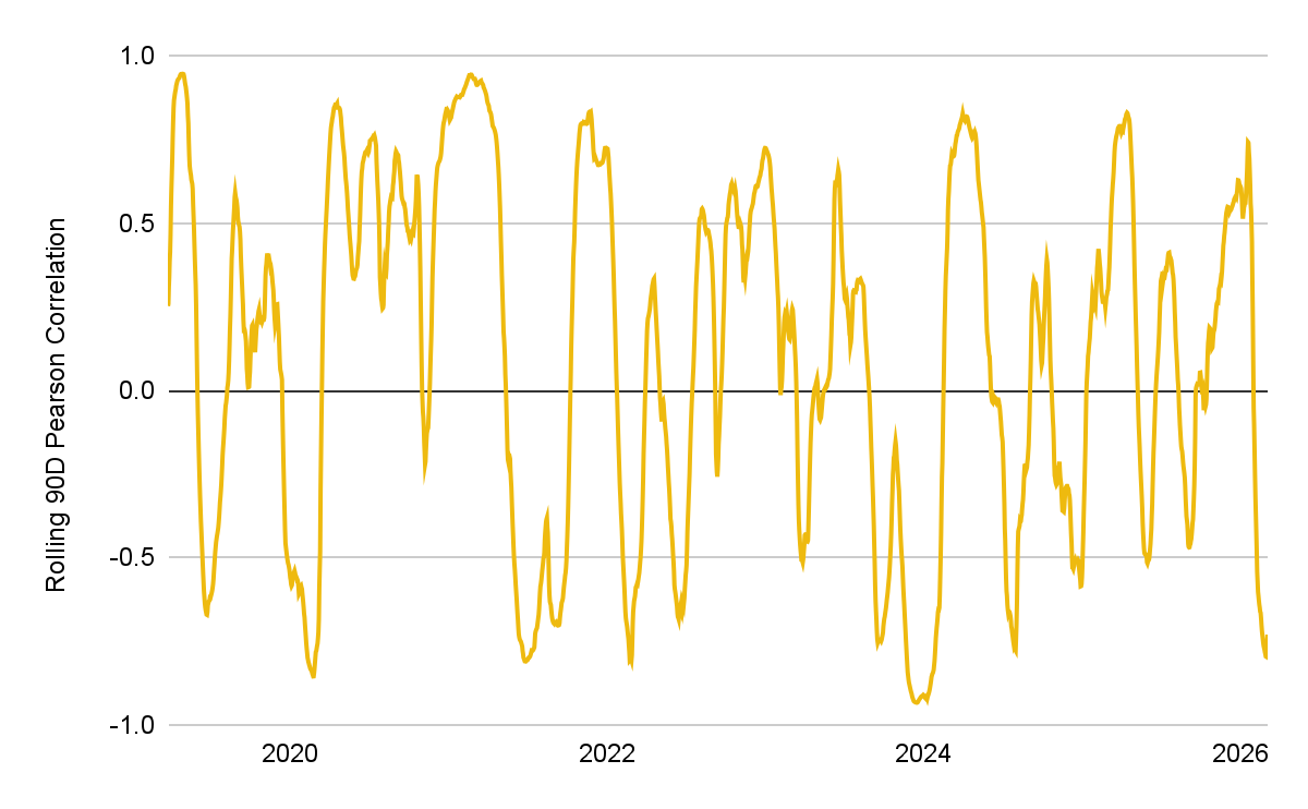 이번 사태는 비트코인과 원유의 관계를 다시 생각하게 만들었습니다. 현재 기준으로 보면 비트코인과 WTI 유가는 90일 롤링 상관계수 기준 음의 상관관계를 보이고 있습니다. 단순하게 보면 유가가 오를수록 비트코인은 약세를 보이는 구조처럼 보일 수 있습니다. 에너지 가격 상승이 성장 둔화와 인플레이션 압력을 동시에 자극하기 때문입니다.