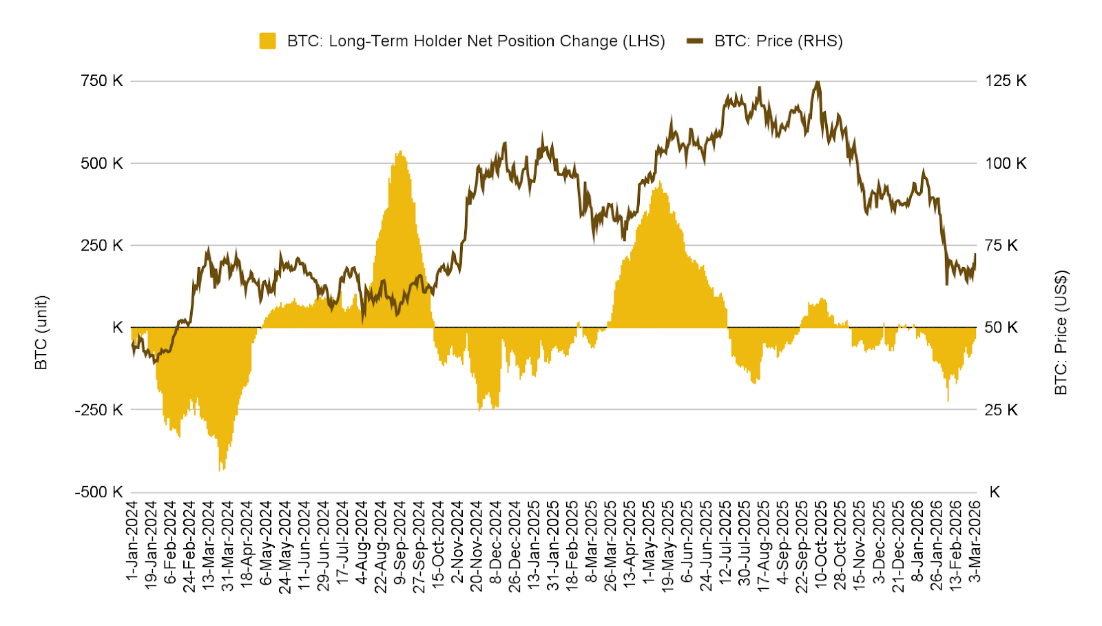 온체인에서도 비슷한 흐름이 포착됩니다. 장기보유자들의 순분배는 둔화되고 있습니다. 2025년 상승장에서 차익실현에 나섰던 장기보유자들 중 적극적 매도자는 상당 부분 정리를 마친 것으로 보입니다. 아직 본격적인 재축적이 시작된 것은 아니지만, 매도 압력이 줄고 있다는 점 자체는 긍정적입니다.