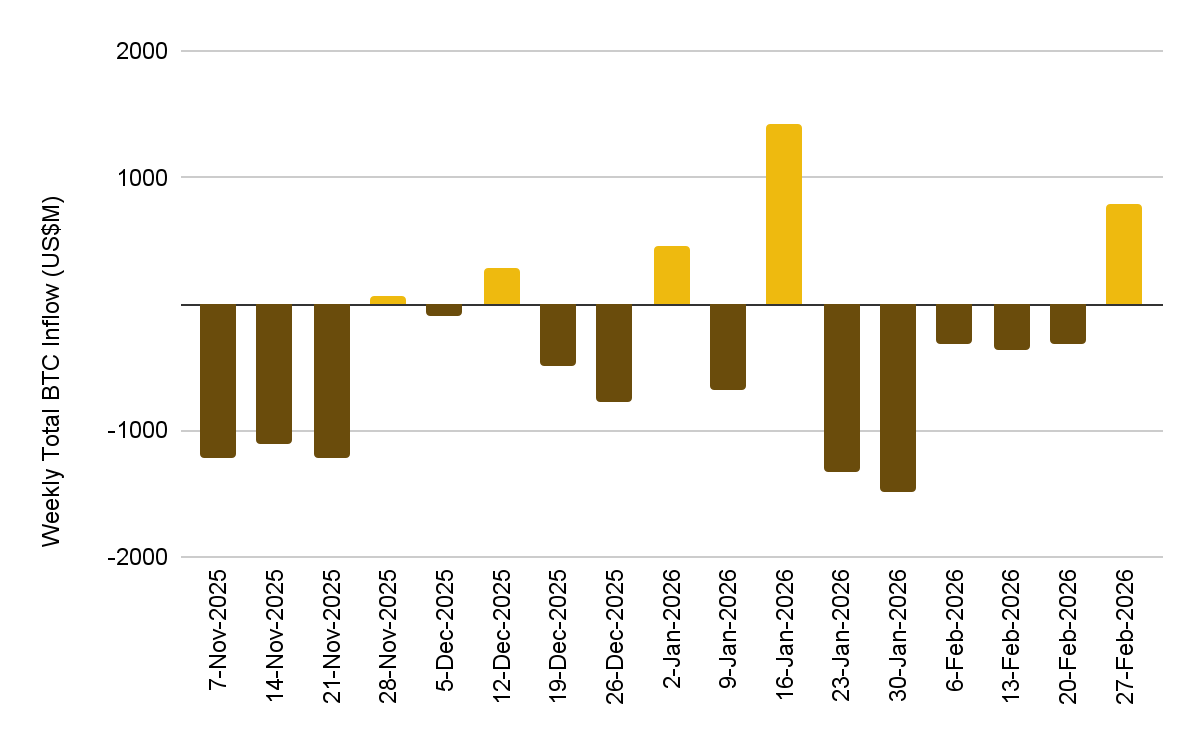 여기에 ETF 자금 흐름도 오랜만에 개선 조짐을 보였습니다. 비트코인 현물 ETF는 1월 중순 이후 처음으로 주간 순유입을 기록했습니다. 단 한 주의 플러스 흐름만으로 추세 전환을 말하기는 어렵지만, 적어도 지난 몇 주간 이어진 구조적 매도 압력이 다소 완화되고 있다는 신호로는 해석할 수 있습니다.