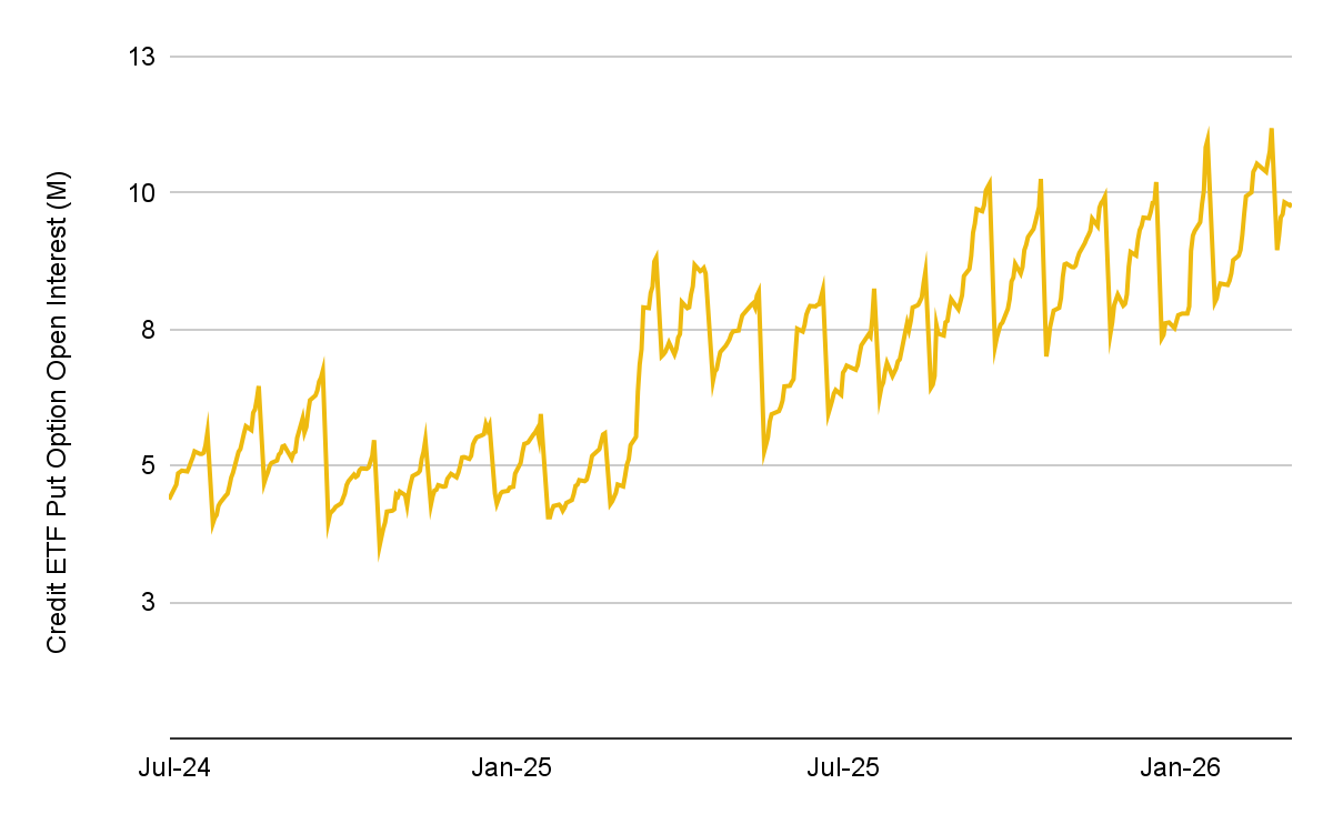 만약 AI 자본지출 기대가 약해지거나, 소프트웨어 수익성 둔화가 실제로 투자 축소로 이어진다면, 이 구간에 몰린 크레딧은 빠르게 재평가될 수 있습니다. 최근 주요 크레딧 ETF에서 풋옵션 수요가 늘고 있는 것도 이러한 꼬리위험에 대한 경계심을 반영합니다.
