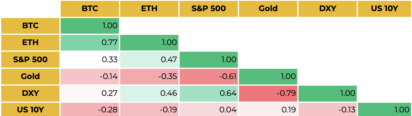 - BTC-S&P 500 2개월 상관계수는 전주 0.40에서 0.33으로 하락.