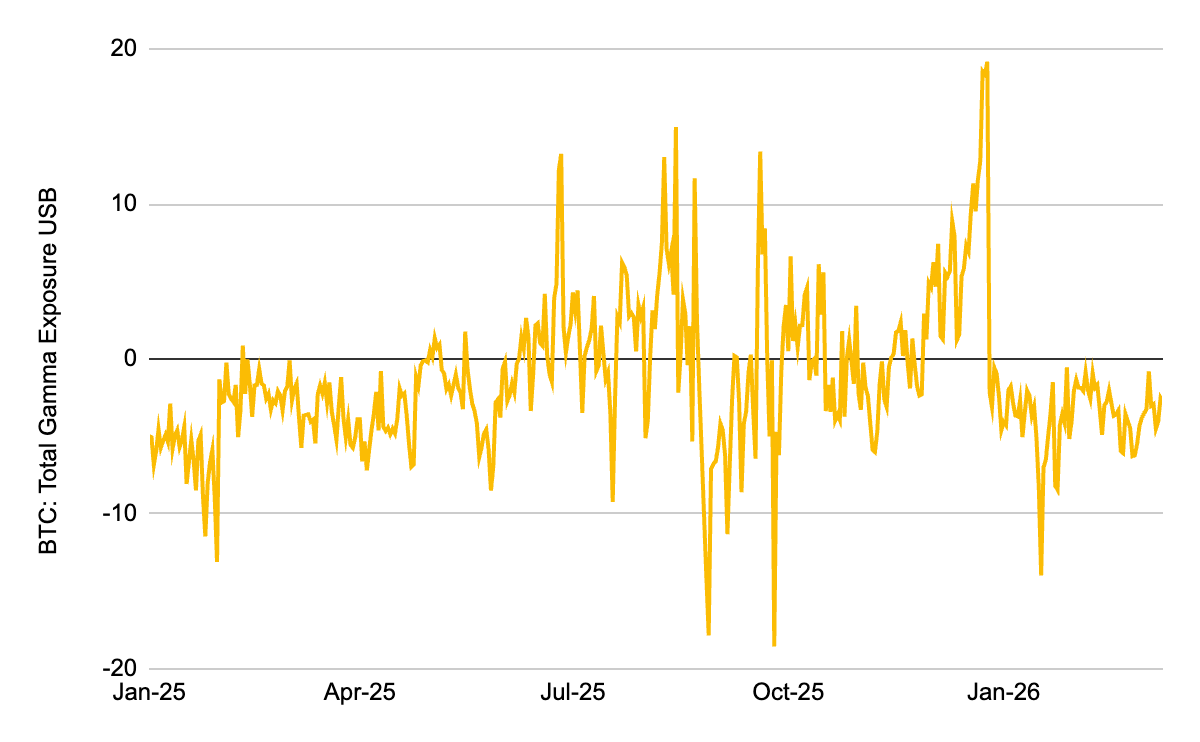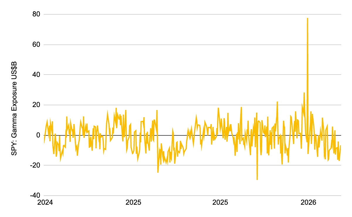 - 비트코인과 미국 주식(SPY) 시장 조성자들은 여전히 깊은 네거티브 감마 영역에 머물러 있습니다. 이는 가격 발견 메커니즘이 비선형적으로 변했음을 의미하며, 현재의 포지셔닝 구조하에서는 동일한 강도의 지정학적 충격이 가해지더라도 시장 반응이 훨씬 증폭되므로 리스크 관리가 최우선시되어야 합니다.