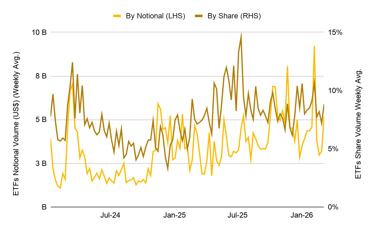 현재 미국 주식 시장의 경우 전체 주식 거래량 대비 ETF 거래량 비중이 30~40%에 달하지만, BTC 현물 ETF 거래량은 전체 거래소 현물 거래량의 약 9% 수준에 불과합니다. 이는 단기적인 지정학적 위기에도 불구하고, 미국 자본의 BTC 시장 참여가 향후 더욱 확대될 수 있는 구조적 여력이 충분함을 시사합니다.