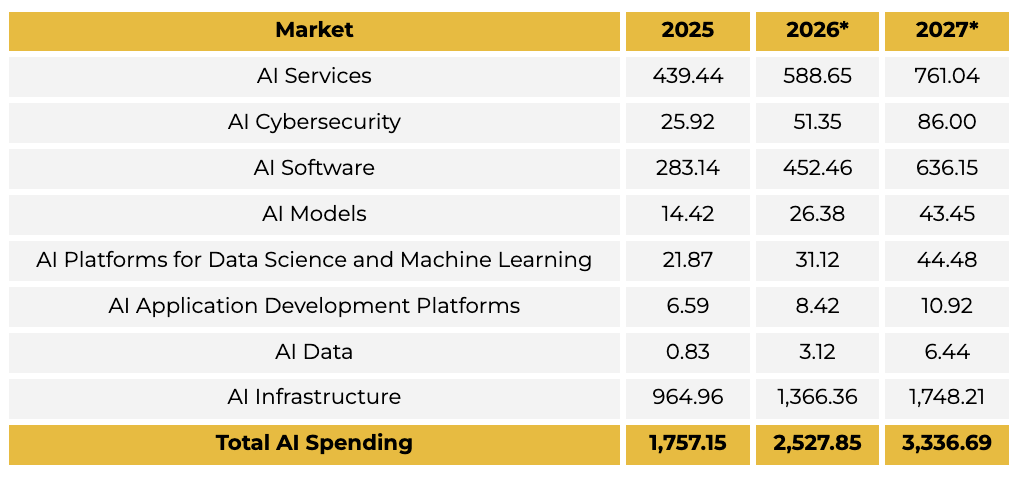 AI로 유입되는 자본의 규모는 전례가 없습니다. 가트너는 전 세계 AI 지출이 2025년 1조 7,600억 달러에서 2026년 2조 5,200억 달러, 2027년에는 3조 3,400억 달러까지 증가할 것으로 전망하고 있으며, 이 가운데 AI 인프라가 전체 지출에서 가장 큰 비중을 차지할 것으로 보고 있습니다.
