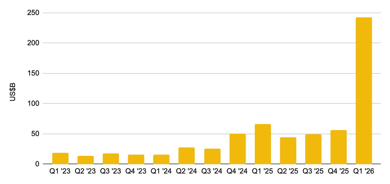 민간 시장도 같은 방향을 가리키고 있습니다. 크런치베이스는 2026년 1분기 AI 기업들이 약 2,420억 달러를 조달했으며, 이는 해당 분기 전 세계 벤처 투자금의 약 80%에 해당한다고 추산했습니다. 일부 초대형 라운드가 분기 실적을 끌어올린 것은 사실이지만, 더 중요한 함의는 여전히 유효합니다. AI는 이제 여러 성장 테마 중 하나가 아니라, 이용 가능한 민간 자본의 과도하게 큰 비중을 흡수하는 중심 테마가 되었다는 점입니다.