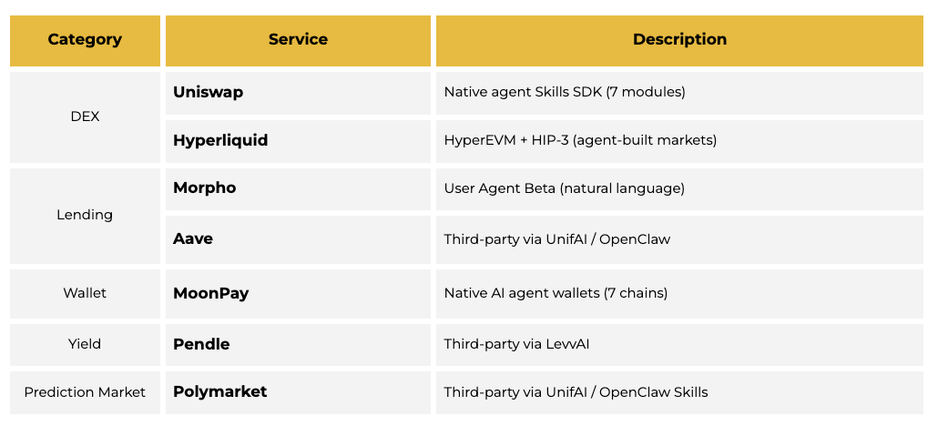 에이전트 연동 실행은 이제 여러 주요 프로토콜에서 실사용 단계에 들어왔고, 그 구조는 크게 두 방향으로 나뉘고 있습니다. 하나는 프로토콜 자체가 제공하는 에이전트 SDK이고, 다른 하나는 여러 프로토콜에 걸친 에이전트 활동을 한 번에 라우팅하는 서드파티 애그리게이터 레이어입니다. 2월에 공개된 Uniswap의 7개 오픈소스 Skills는 특히 주목할 만한 진전이었습니다. 이는 최대 규모의 DEX 위에서 자율 에이전트를 위해 설계된 첫 프로토콜 네이티브 툴킷 중 하나였기 때문입니다.