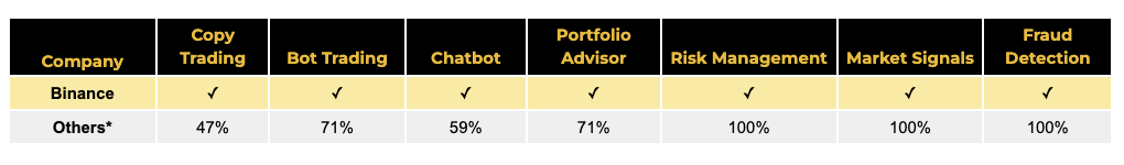 다만 주요 트레이딩 플랫폼 전반에서 AI 기능 도입 수준은 아직 고르지 않습니다. 리스크 관리, 시장 신호, 사기 탐지 같은 기능은 거의 보편적으로 적용되고 있지만, 카피트레이딩, 챗봇, 포트폴리오 어드바이저 같은 사용자 대상 기능은 조사 대상 17개 플랫폼 중 47~71% 수준에만 채택되어 있어 제품 레이어에서의 차별화 여지가 여전히 크다는 점을 보여줍니다.