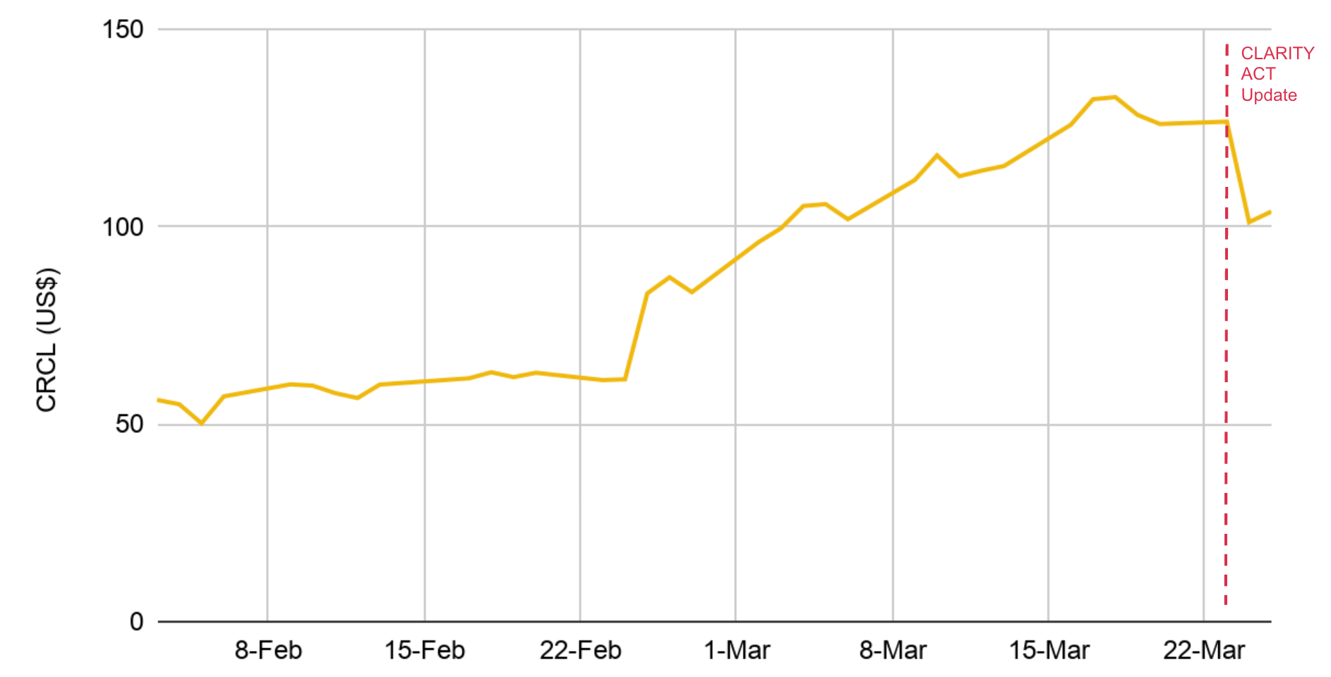 스테이블코인 공급량 자체는 사상 최고 수준을 유지하며 계속 증가하고 있습니다. 현재 약 3,160억 달러 규모입니다. 그러나 충격은 스테이블코인 비즈니스 모델을 반영하는 상장 주식들에서 나타났습니다. 가장 대표적인 스테이블코인 관련 상장주는 Circle(CRCL)인데, 3월 24일 하루에 거의 20% 하락하며 상장 이후 최악의 단일일 하락을 기록했습니다. 이 구분은 중요합니다. 시장은 스테이블코인에 대한 근본 수요를 재평가한 것이 아니라, 스테이블코인의 유통 및 배분 경제성을 재평가하고 있는 것입니다.