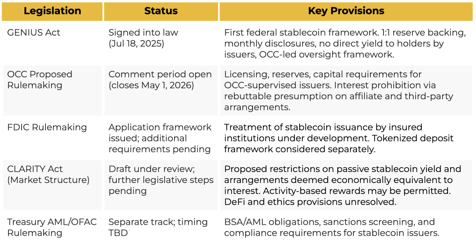 스테이블코인 공급량은 약 3,160억 달러에 도달했으며, 수익률, 결제, 기관 채택의 결합에 힘입어 보다 넓은 크립토 시장과 독립적으로 성장하고 있습니다. 규제는 이러한 성장의 핵심 촉매였으며, 기관 측 모멘텀의 상당 부분은 GENIUS Act 이후에 형성되었습니다. CLARITY Act의 최종 조항, 특히 수익률과 디파이 취급 방식이 어떻게 정리되느냐에 따라 이 같은 성장 궤도가 더 가속될지, 아니면 완화될지가 결정될 것입니다.