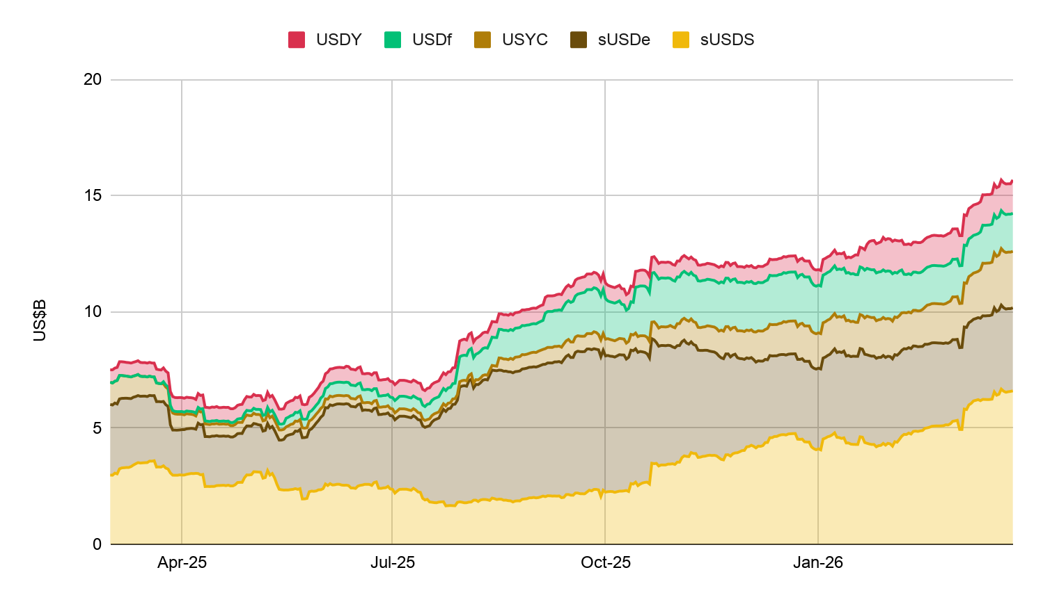 수익률형 스테이블코인 세그먼트는 크립토에서 가장 빠르게 성장한 영역 중 하나였습니다. 주요 플레이어들을 기준으로 보면 공급량은 1년 전 약 70억 달러에서 현재 156억 달러 이상으로 증가했으며, 전체 스테이블코인 시장의 거의 5%를 차지합니다.