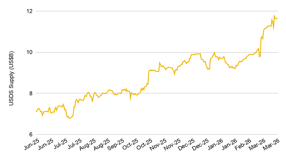 이번 규제 논쟁은 스테이블코인 펀더멘털이 오히려 그 어느 때보다 강해 보이는 시점에 벌어지고 있습니다. 공급량은 약 3,160억 달러에 이르며, 지난 1년 동안 전체 공급의 약 3분의 1이 새로 증가했습니다. 더 중요한 점은 스테이블코인 성장세가 보다 넓은 크립토 시장과 디커플링되었다는 것입니다.