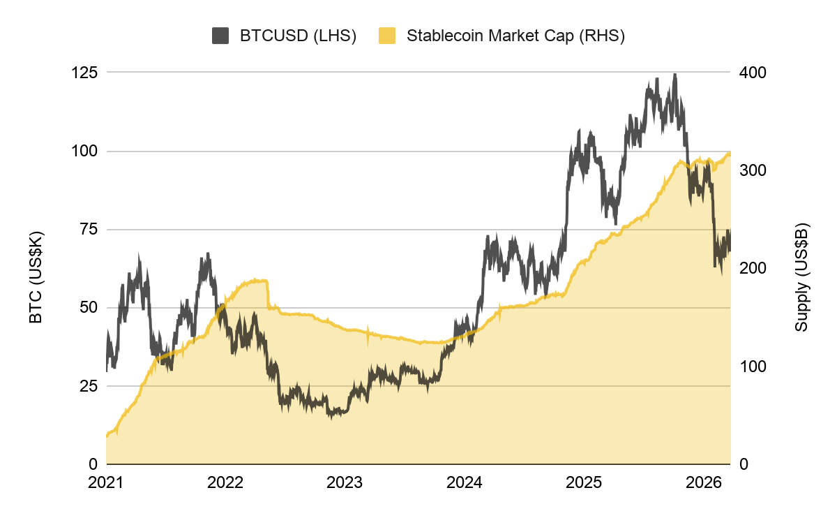 이번 규제 논쟁은 스테이블코인 펀더멘털이 오히려 그 어느 때보다 강해 보이는 시점에 벌어지고 있습니다. 공급량은 약 3,160억 달러에 이르며, 지난 1년 동안 전체 공급의 약 3분의 1이 새로 증가했습니다. 더 중요한 점은 스테이블코인 성장세가 보다 넓은 크립토 시장과 디커플링되었다는 것입니다.